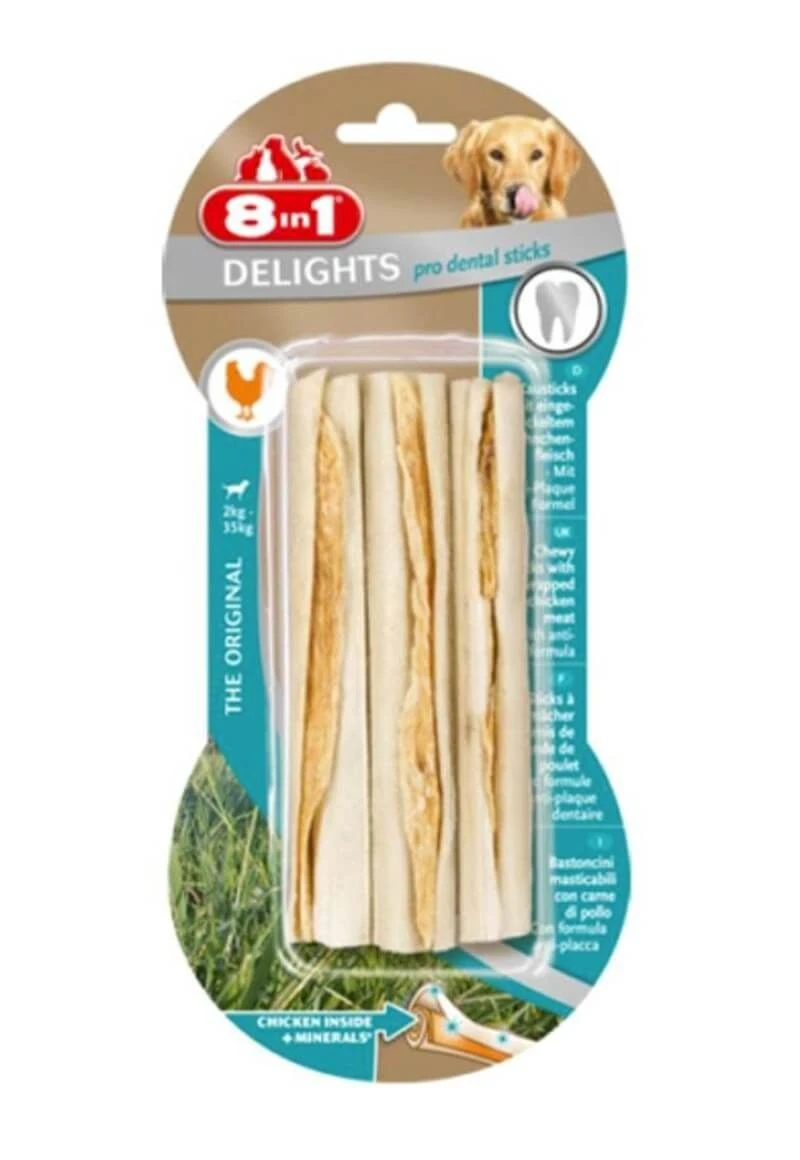 Les Sticks Pro Dental Bone de 8in1 Delights sont une délicieuse friandise à base de viande de poulet compressée dans une peau de bœuf très ferme de qualité supérieure qui contient également des sels minéraux renforçant l’action des os à mâcher sur l’hygiène dentaire.