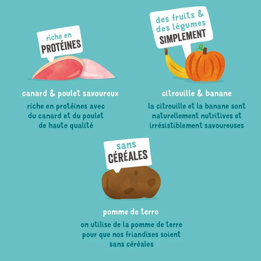 Imaginez recevoir la friandise parfaite au parfait moment. Ça fait plaisir, n’est-ce pas ? C’est exactement pour cela que nous avons créé les Moelleuses gourmandises au poulet. Que vous soyez dehors par monts et par vaux, ou en train de faire des câlins sur le canapé, voici une friandise nourrissante et délicieuse pour montrer à votre chien à quel point il compte pour vous, à ce moment précis. Convient aux chiens adultes stérilisés ou actifs de toutes races.